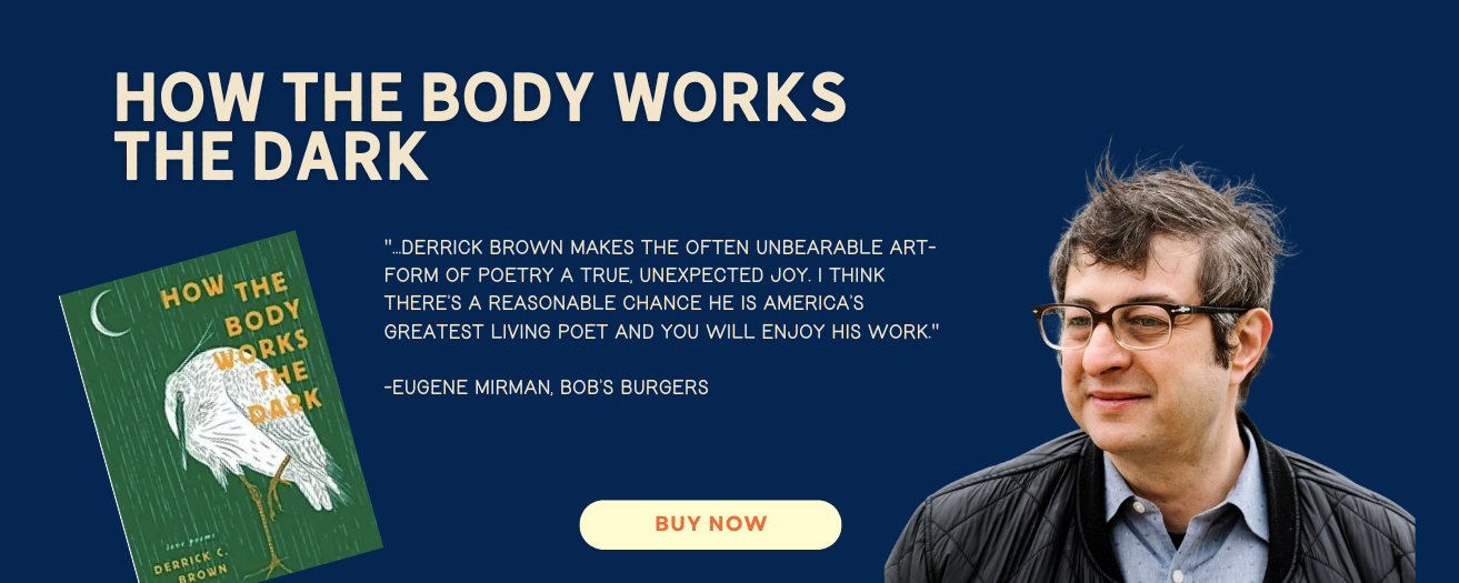 "There’s something that happens when you read Derrick Brown, a rekindling of faith in the weird, hilarious, shocking, beautiful power of words... When you read any of his work...or when you have the fantastic fortune to watch him perform it in person, you yourself are a bit more alive."